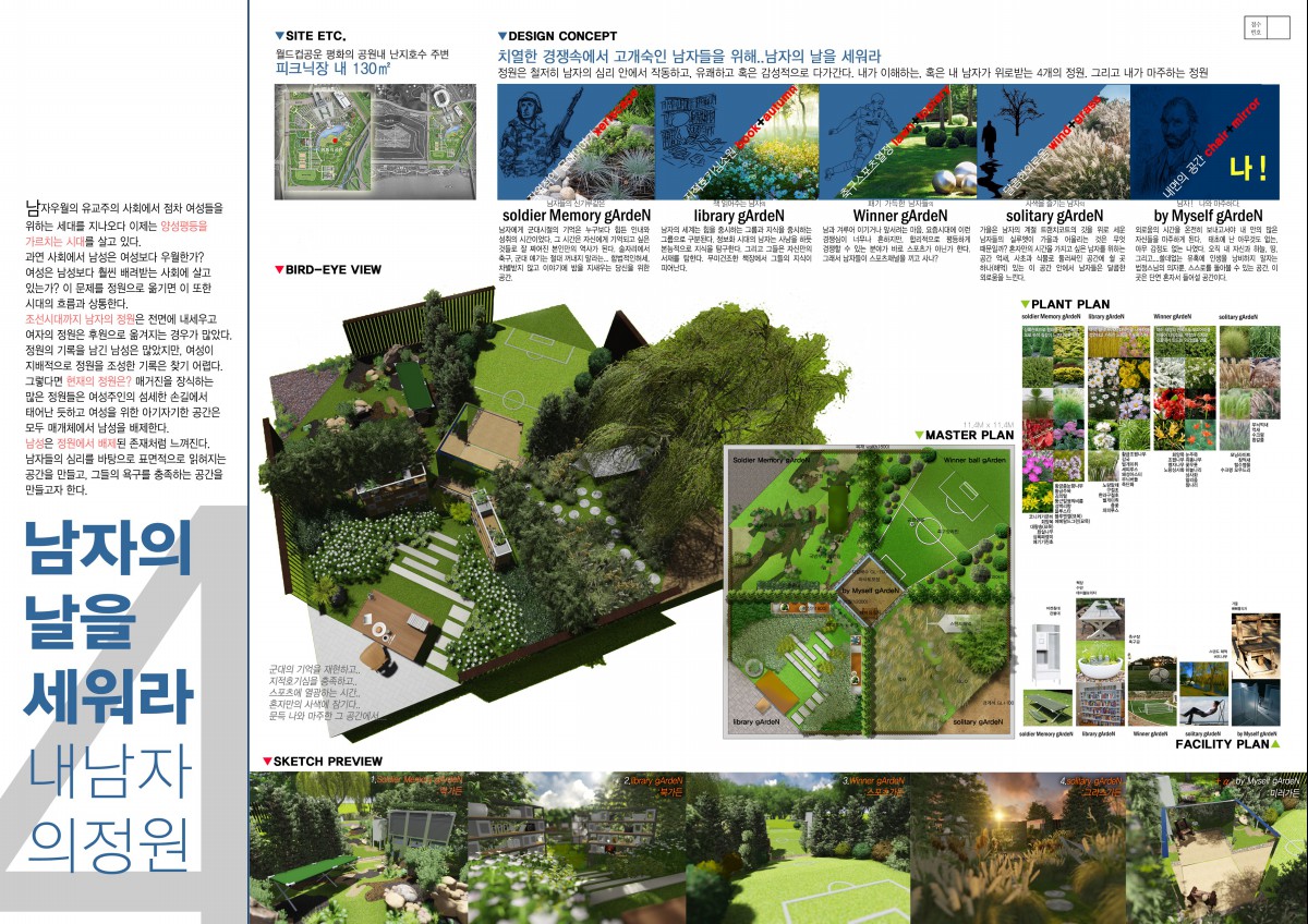 작품명 내 남자의 정원 작가명 윤준 작품소개 ‘내 남자의 정원’은 여성의 손길과 감성에 초점을 맞춘 다수의 정원과는 반대편에 있는 남성의 관점에서 만들어진 정원이다. 이 시대를 살고 있는 남성의 기억과 욕망을 정원이라는 공간에서 위트있게 보여주고 여성들에게는 이성을 좀 더 이해할 수 있는 정원이다. 작가소개 윤준 현재 (주)한국고유식물연구소 대표이사 2015 코리아가든쇼, 2014 드림파크정원축제 우수상 수상 작품설명 ‘내 남자의 정원’은 여성의 손길과 감성에 초점을 맞춘 다수의 정원과는 반대편에 있는 남성의 관점에서 만들어진 정원이다. 이 시대를 살고 있는 남성의 기억과 욕망을 정원이라는 공간에서 위트있게 보여주고 여성들에게는 이성을 좀 더 이해할 수 있는 정원이다. 작품조성과정 조성과정 최종완성 작품판넬