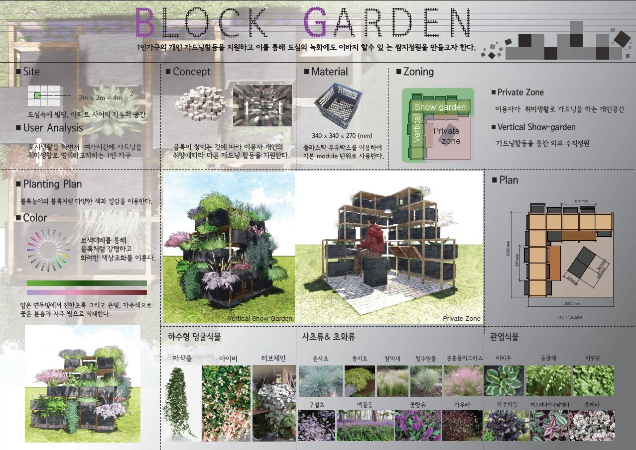 1인 가구가 증가하면서 취미활동으로 가드닝을 하는 사람들이 늘고 있다. 하지만 이들은 소극적인 가드닝 활동에 머물러있다. 이런 1인 가구들의 적극적인 가드닝 활동을 도울 수 있는 공간을 만들고자하였다. 실외 빌딩 자투리 공간에 조그마한 쌈지정원을 조성하여 개인이 취미생활을 할 수 있는 공간을 만들고, 개인의 활동이 하나의 쇼가든 형태의 수직정원을 만들어 도시녹화에 이바지 할 수 있는 안을 제시한다.