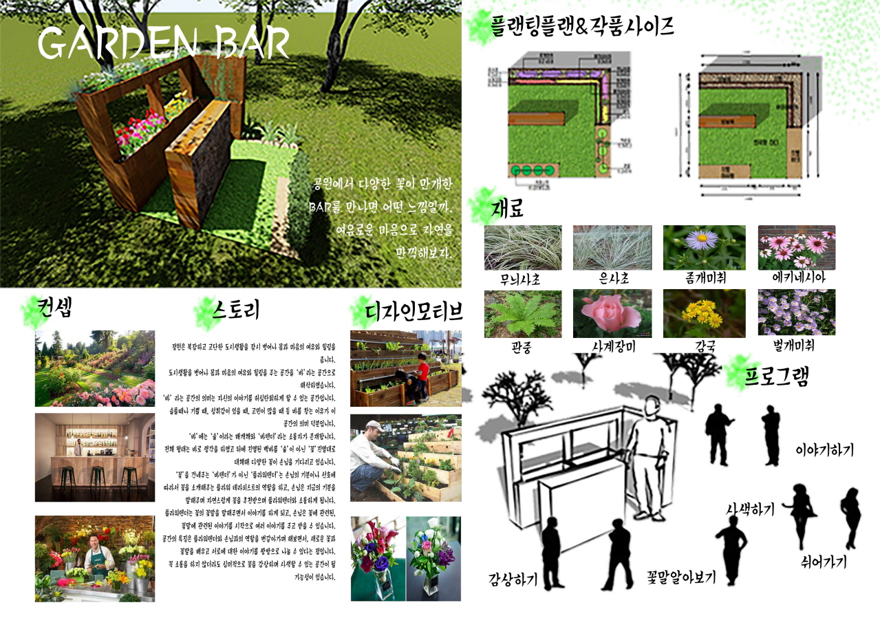 작품명 GARDEN BAR 작가명 이병우 작품소개 'BAR'라는 공간은 사람들에게 기쁠때나 슬플때 혹은 기념하고자 하는 날에 찾는 공간이다. 'GARDEN BAR'는 열린공간에서 혼자 또는 여럿이 자유롭게 휴식할 수 있는 공간이며, 감상과 사색이 들어있는 정원이다. 작가명 이병우 작품설명 BAR'라는 공간은 사람들에게 어떤 공간인가. 기쁠때나 슬플때 혹은 기념하고자 하는 날에 찾는 공간이라고 생각한다. 'GARDEN BAR'는 열린공간에서 혼자 또는 여럿이 자유롭게 휴식할 수 있는 공간이며, 감상과 사색이 들어있는 정원이다. 최종완성 작품판넬