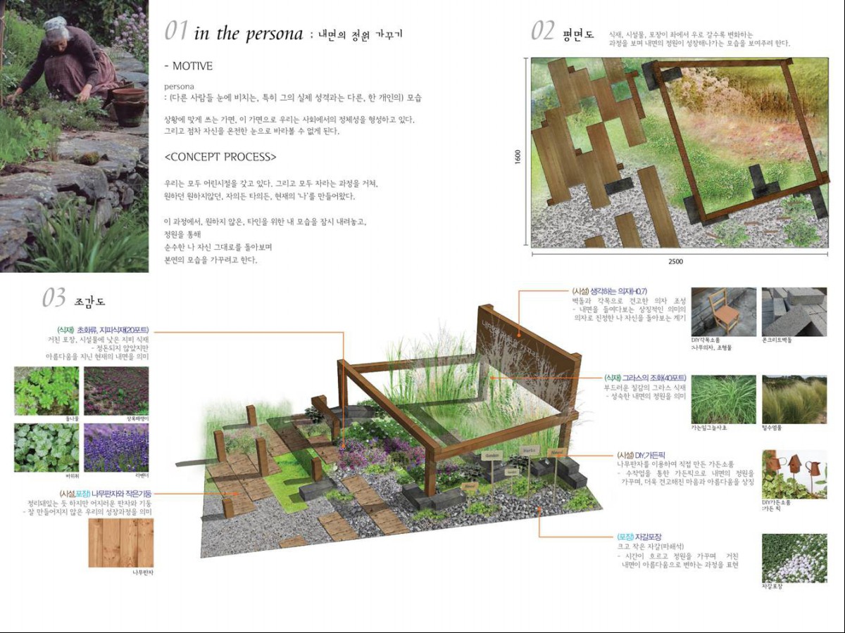 작품명 “in the persona”:내면의 정원 가꾸기 작가명 양은미, 류광하 작품소개 우리는 모두 자라는 과정을 거쳐 자의에 의해서든 타의에 의해서든 현재의 '나'를 만들어왔다. 정원을 만드는 과정 속에서 타인을 위한 내 모습을 잠시 내려놓고, 정원을 통해 순수한 나 자신을 돌아보며 내면의 정원을 가꾸려고 한다. 작가명 양은미, 류광하 작품설명 우리는 모두 자라는 과정을 거쳐 자의에 의해서든 타의에 의해서든 현재의 '나'를 만들어왔다. 정원을 만드는 과정 속에서 타인을 위한 내 모습을 잠시 내려놓고, 정원을 통해 순수한 나 자신을 돌아보며 내면의 정원을 가꾸려고 한다. 최종완성 작품판넬