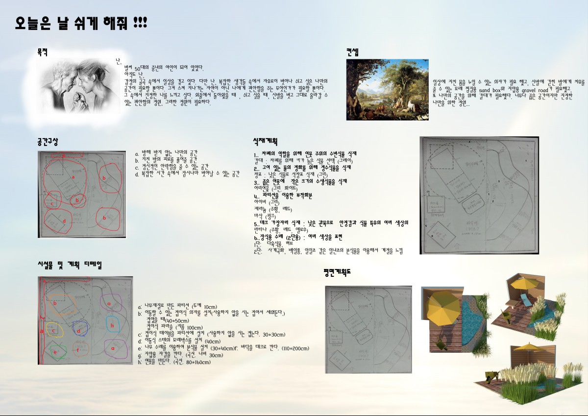 어느덧 50대 중년의 여인이 되어 버린 나에게는 아무에게도 방해받지 않는 공간이 필요했다. 지쳐있는 나에게 휴식이 필요할 때, 신발을 벗고 그대로 올라갈 수 있는 편안함의 공간속에서 진정한 나를 느끼고 싶었다.