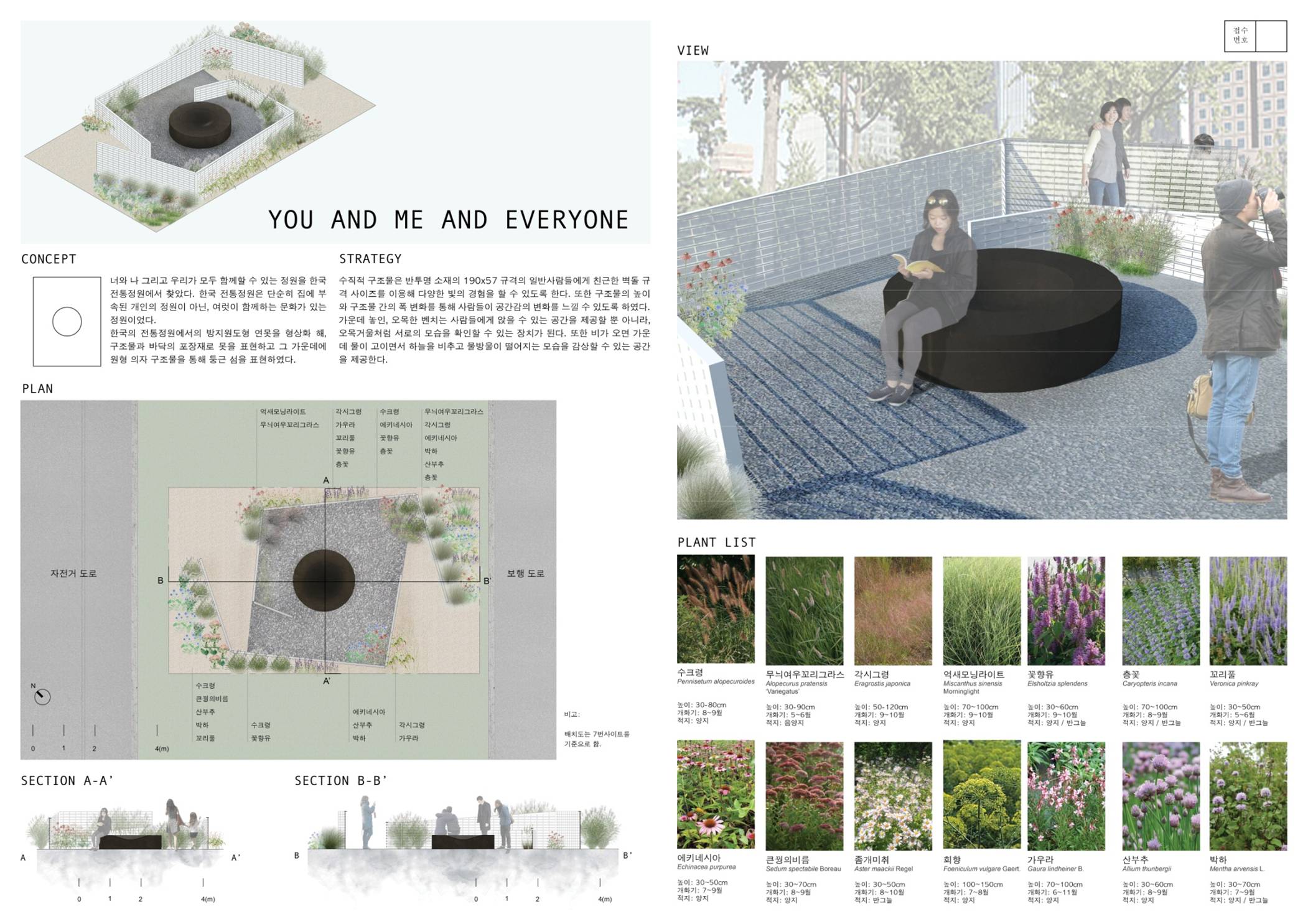 너와 나 그리고 우리가 모두 함께 할 수 있는 정원을 한국 전통정원에서 찾았다. 한국 전통정원은 단순히 집에 부속된 개인의 정원이 아닌, 여럿이 함께하는 문화가 있는 정원이었다. 한국의 전통정원에서 방지원도형 연못을 새롭게 해석하여, 구조물과 바닥의 포장재로 못을 표현하고 그 가운데에 원형 의자 구조물을 통해 둥근 섬을 표현하였다.