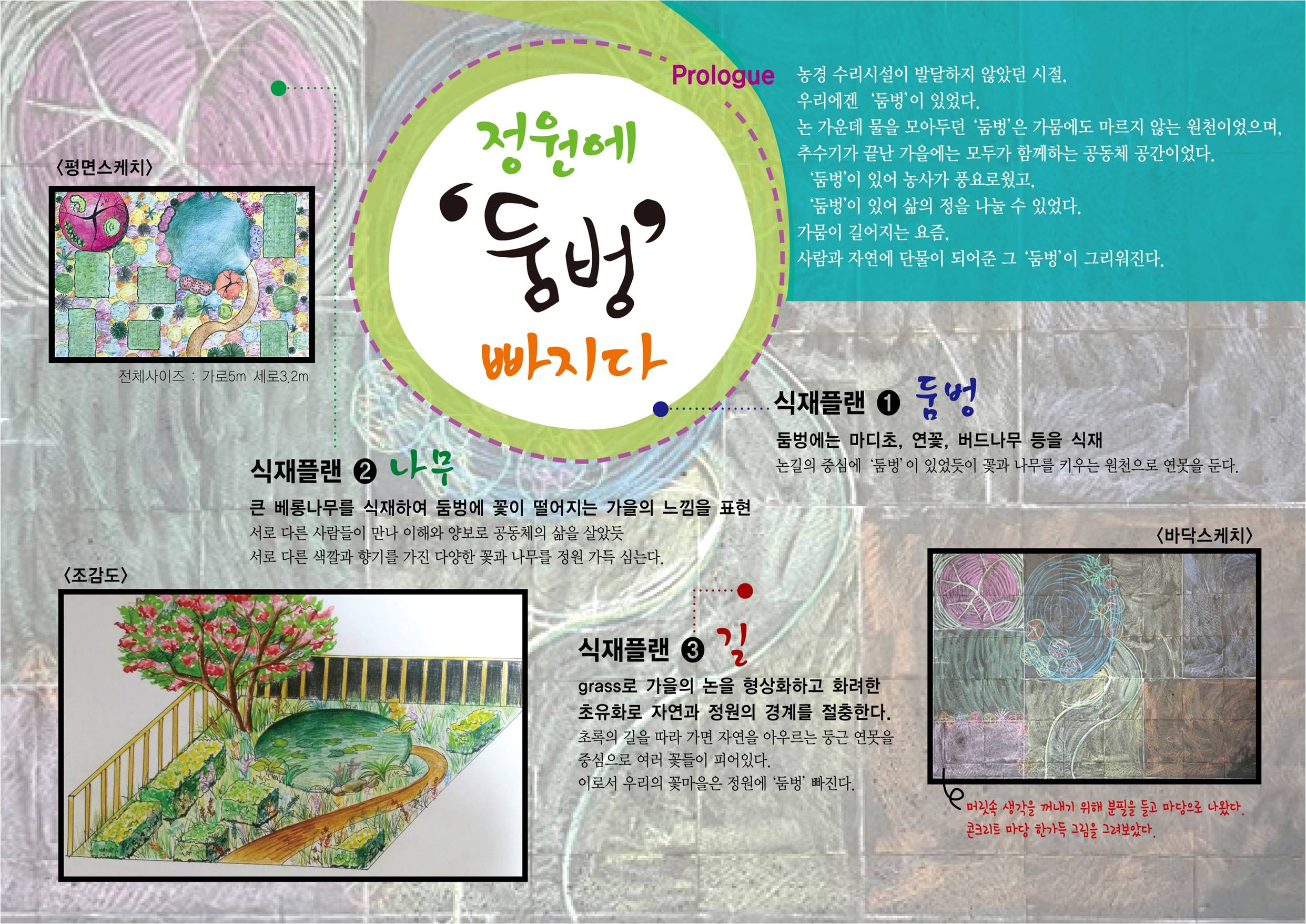 - 과거보다 현재를 살아가는 우리는 분명 풍요로워 졌지만 또한 무언가에 메말라 있는 듯합니다. 언뜻 보면 작은 웅덩이에 불과한 '둠벙'은 자연이 살아가고 그 위에 인간이 더불어 살아갈 수 있는 우리의 고유한 문화유산입니다. 내 삶을 풍요롭게 하고 메마른 영혼에 물을 데어줄 우리 삶의 '둠벙'. 그 근원을 정원에서 찾을 수 있기를 기원합니다.
