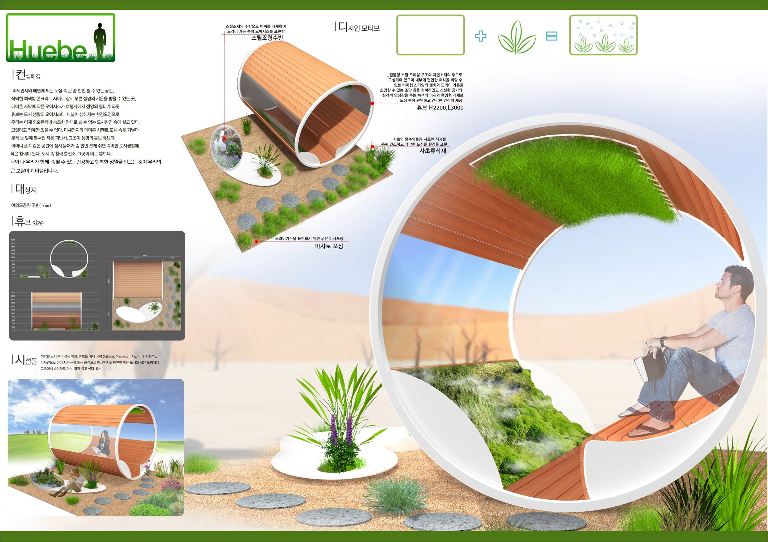 메마른 사막에서 작은 오아시스가 여행자에게 생명의 쉼터가 되듯 휴브는 도시 생활의 오아시스다. 미세먼지와 메마른 회색 도시 속을 거닐다 문득 눈앞에 펼쳐진 작은 피난처, 그곳이 생명의 튜브 휴브다. 어머니 품속 같은 공간에 잠시 들어가 숨 한번 크게 쉬면 각박한 도시 생활에 작은 활력이 된다. 도시 속 활력 충전소. 그곳이 바로 휴브다.