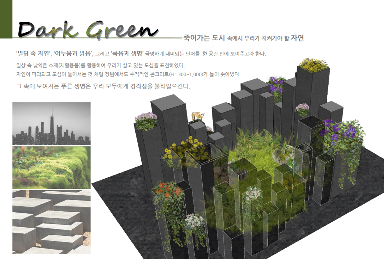 ‘도심과 자연’, ‘죽음과 생명’ 그리고 ‘어두움과 밝음’ 극명하게 대비되는 단어를 한 공간에 보여주고자 한다. 자연이 파괴되고 도심이 들어서는 것처럼 정원에는 수직적인 콘크리트가 높이 솟아있다. 지금 이 순간에도 훼손되어지고 있는 소중한 자연을 지키고자 일상 속 재활용품을 활용하여 도심을 표현하였다. 그 속의 푸른 생명은 우리에게 경각심을 불러일으킨다.
