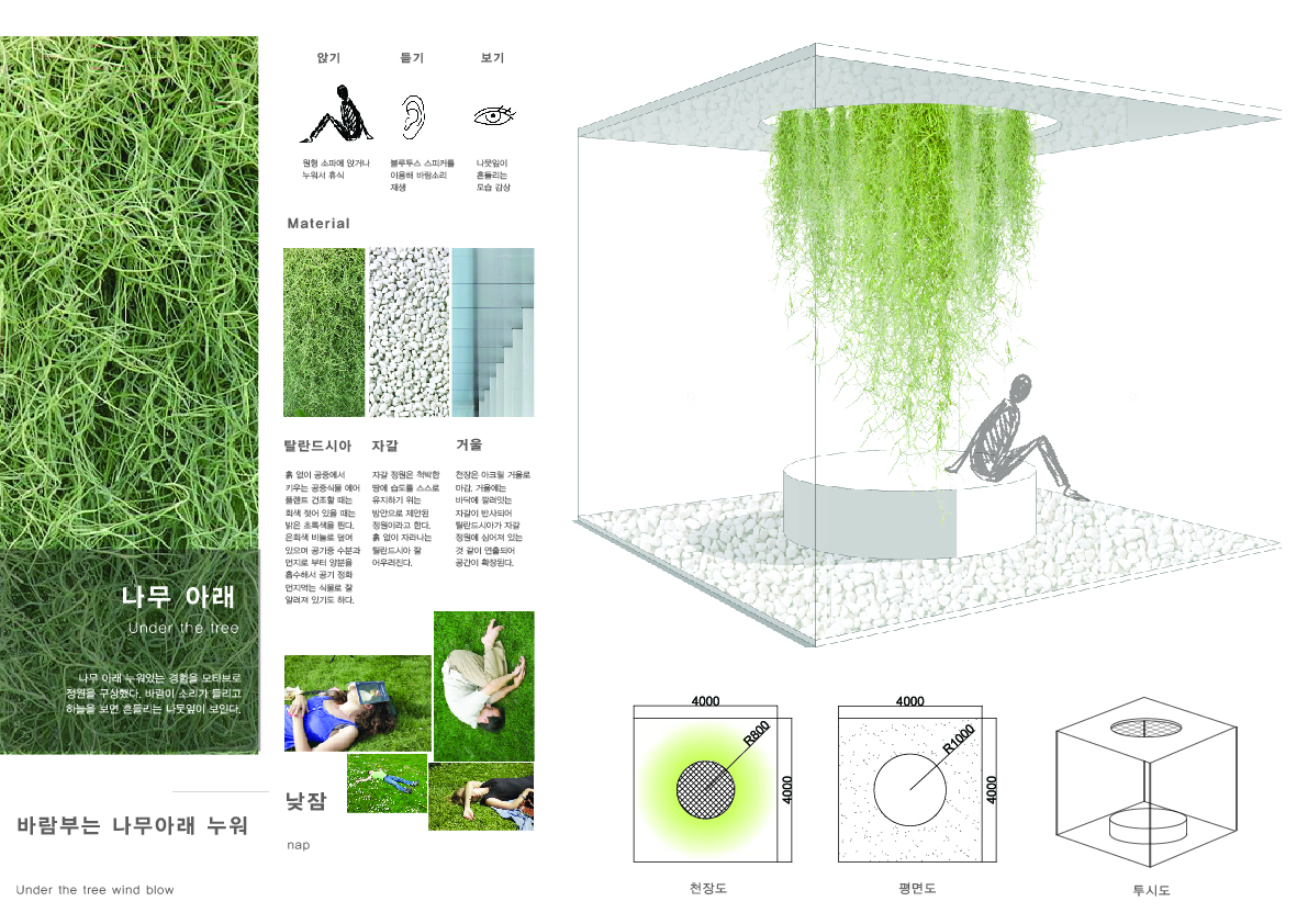 - 나무 아래 누워 있는 경험을 모티프로 구상한 정원이다. 바람소리가 들리고 하늘을 보면 흔들리는 나뭇잎이 보인다. 나무를 통해 경험할 수 있는 감각적 경험을 흙 없이 공중에서 키우는 공중식물 에어플랜트로 재현한다. 땅이 부족한 도시에서 토지에 직접 조성하는 정원의 형식을 벗어나 새로운 형식을 제안한다.