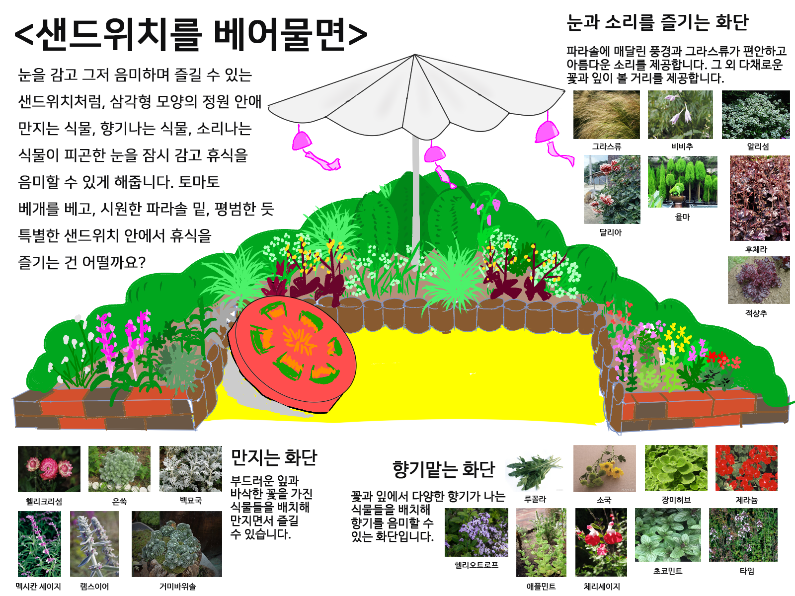 작품명 [동상]샌드위치를 베어물면 작가명 작품소개 눈을 감고 그저 음미할 수 있는 샌드위치처럼, 삼각형 모양의 정원 안에 만지는 식물, 향기 나는 식물, 맑은 소리의 풍경이 피곤한 눈을 잠시 감고 휴식을 음미할 수 있는 공간을 만들어 냅니다. 평범한 듯 특별한 샌드위치 안에서 맛있는 휴식을 즐기는 건 어떨까요? [팀명] 작가명 [모종의 샐러드] 이규정, 이옥선, 윤지원 작품설명 눈을 감고 그저 음미할 수 있는 샌드위치처럼, 삼각형 모양의 정원 안에 만지는 식물, 향기 나는 식물, 맑은 소리의 풍경이 피곤한 눈을 잠시 감고 휴식을 음미할 수 있는 공간을 만들어 냅니다. 평범한 듯 특별한 샌드위치 안에서 맛있는 휴식을 즐기는 건 어떨까요? 작품조성과정 최종완성 작품판넬