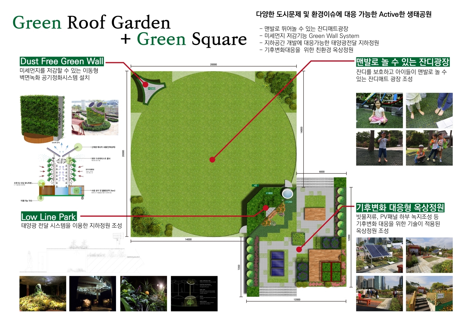 - 1. Dust Free Green Wall - 미세먼지를 저감할 수 있는 이동형 벽면녹화 공기정화시스템 2. Low Line Park - 태양광 전달 시스템을 이용한 지하정원 조성 3. 맨발로 놀 수 있는 잔디광장 - 잔디를 보호하고 아이들이 맨발로 놀 수 있는 잔디매트 조성 4. 기후변화 대응형 옥상정원 - 빗물저류, PV패널 하부 녹지조성 등 기후변화 대응을 위한 기술이 적용된 옥상정원 조성