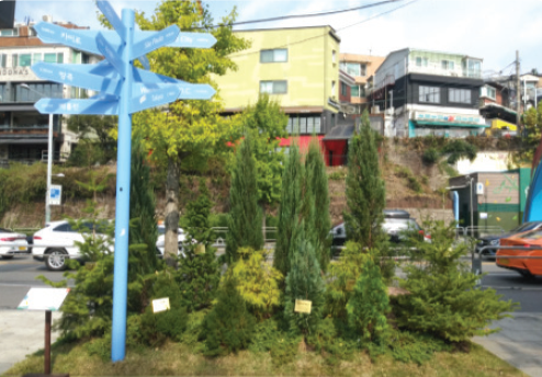 외국인이 한데 모여 사는 삶의 장소를 표현하고자 초록이 다 같은 초록색이 아니라 여러 색깔의 녹색이 있듯이 다양한 초록색의 상록교목 정원으로 다채로운 삶의 장소를 상징화하였습니다.