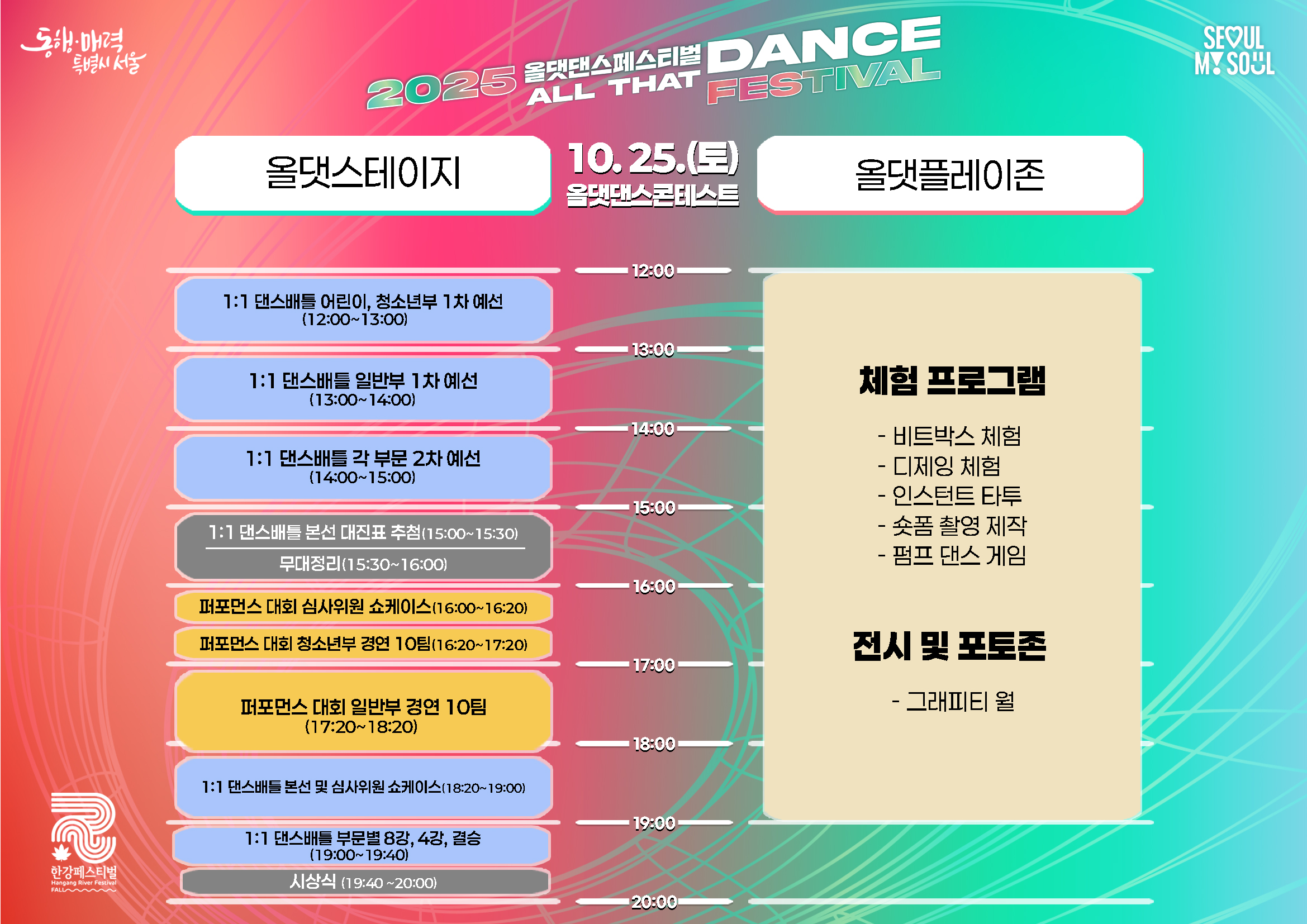 2025올댓댄스페스티벌 ALL THAT DANCE FESTIVAL 2025.10.25.(토)~10.26.(일) 12:00~20:00 뚝섬한강공원 수변무대 일원 https://gov.seoul.go.kr/festa/